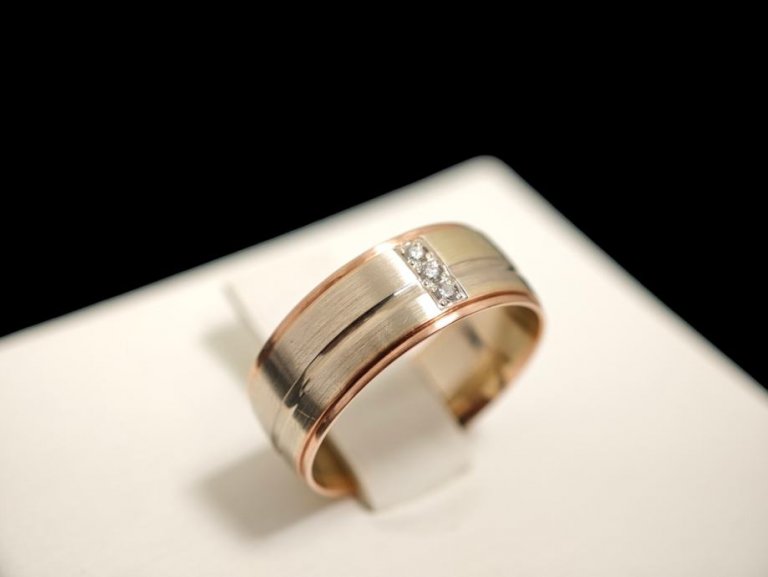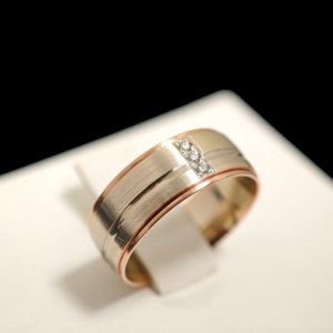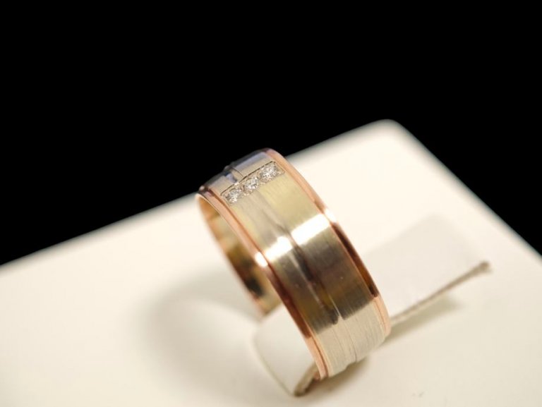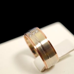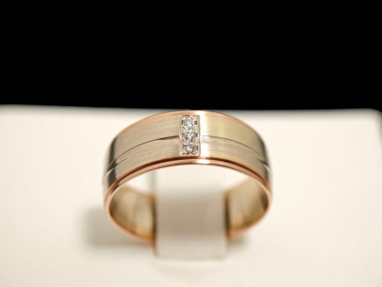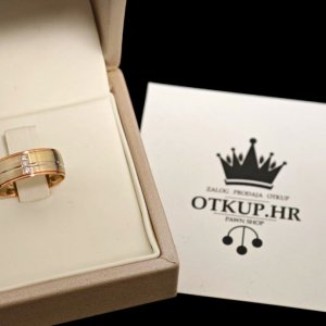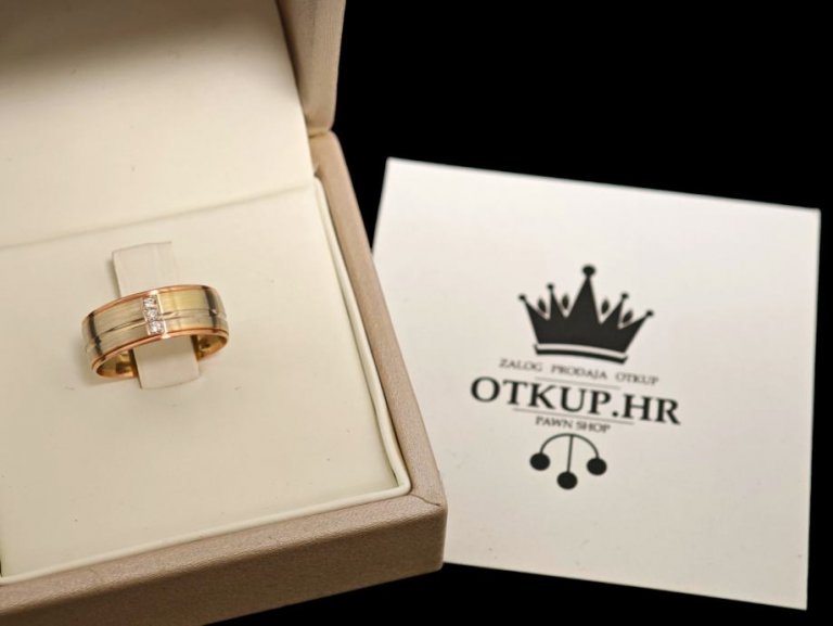 Prodajemo zlatni prsten od 14- karatnog zlata, težine 4,87 grama. Na prstenu se nalaze 3 briljanta 0,015ct.