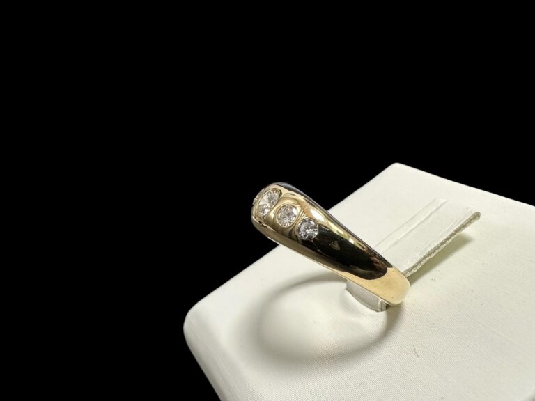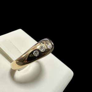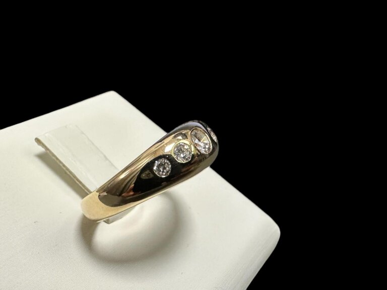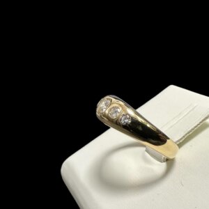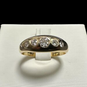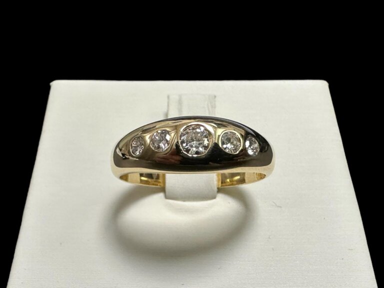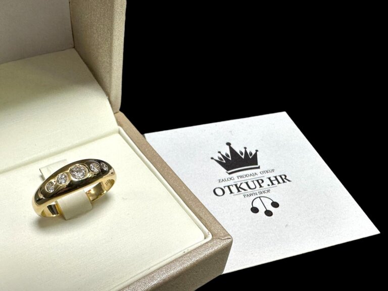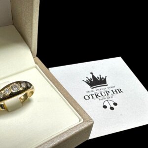 Prodajemo prsten od 14 karatnog žutog zlata ukrašenog sa 5 dijamanata.