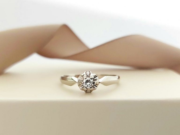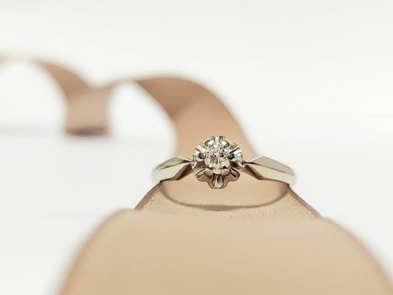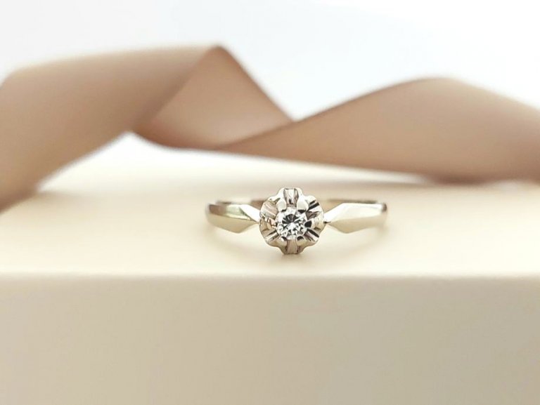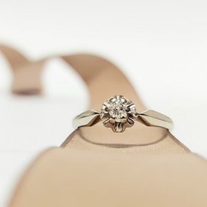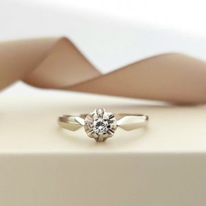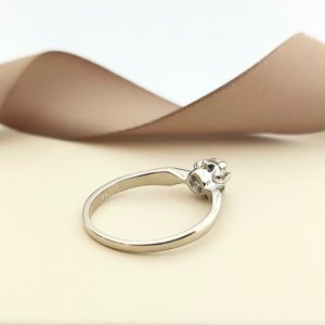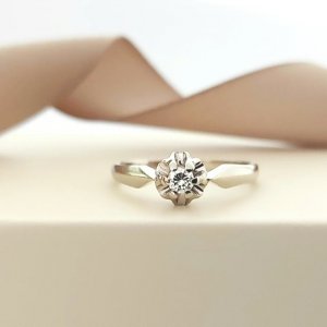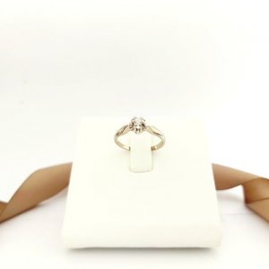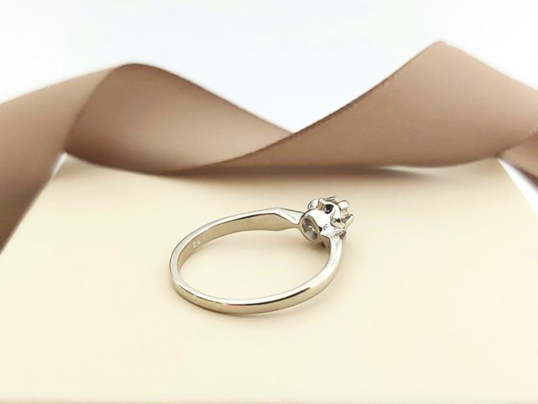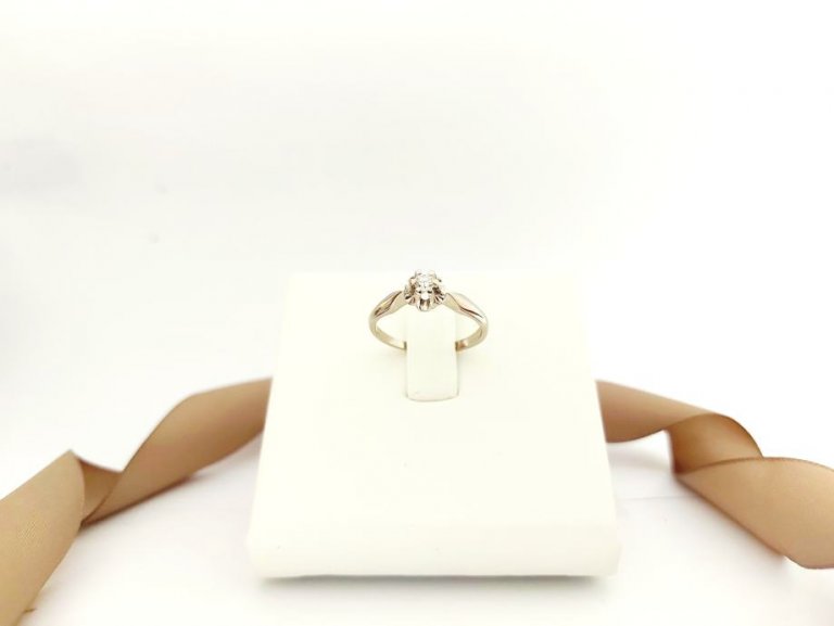 Prodajemo prsten od 14 karatnog bijelog zlata ukrašen sa dijamantom.