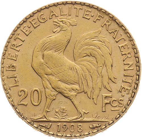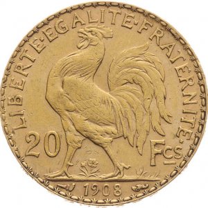 Prodajemo ZLATNIK 20 FRANCS 1908 6.45G (.900).